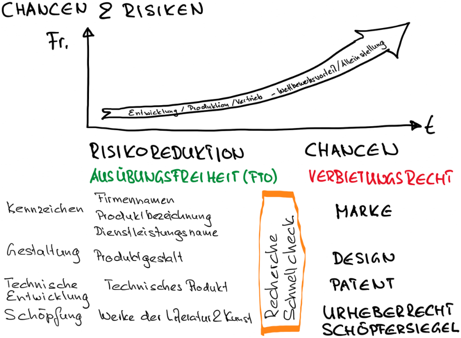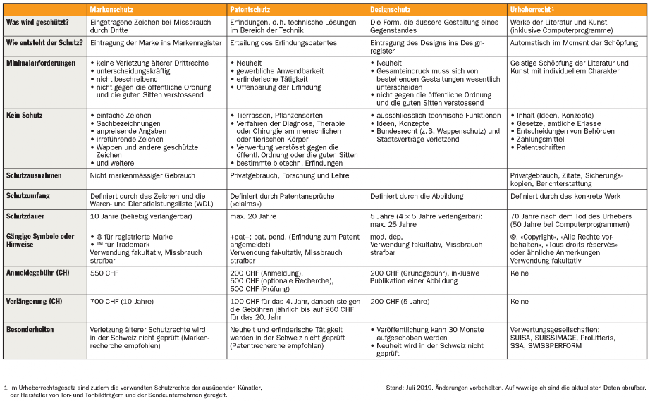 Das IGE fasst in der untenstehenden Zusammenstellung die wesentlichen Punkte der IP-Schutzrechte zusammen: