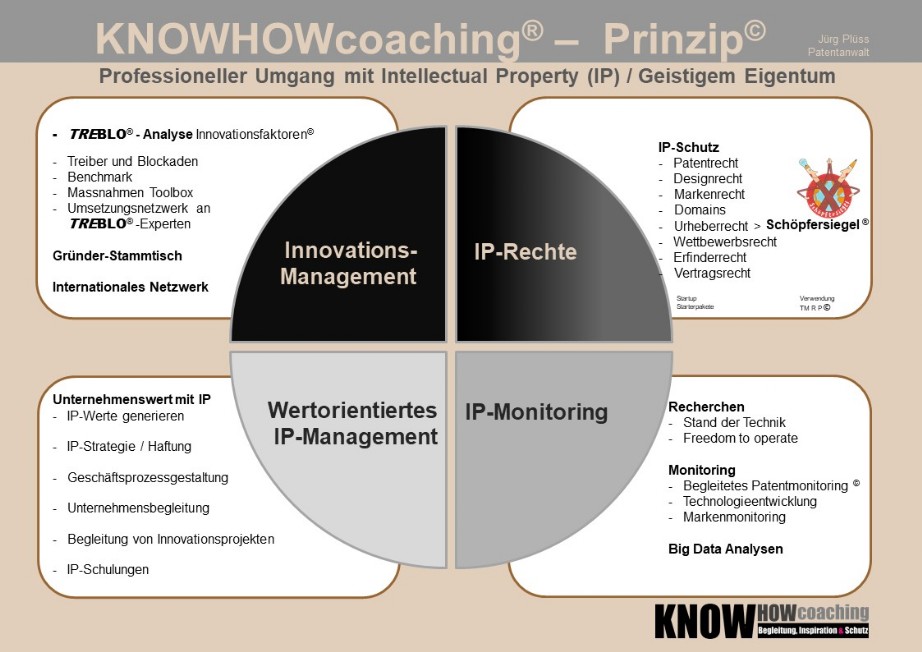 Die KNOWHOWcoaching AG bietet ein umfassendes Angebot im Umgang mit dem Geistigen Eigentum (Intellectual Property - IP)